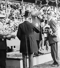 The presentation of the medals and awards varied significantly until the 1932 Summer Olympics in Los Angeles brought in what has now become standard. Before 1932 all the medals were awarded at the closing ceremony, with the athletes wearing evening dress for the first few Games. Originally the presenting dignitary was stationary while the athletes filed past to receive their medals. The victory podium was introduced upon the personal instruction in 1931 of Henri de Baillet-Latour, who had seen one used at the 1930 British Empire Games.[42] The winner is in the middle at a higher elevation, with the silver medallist to the right and the bronze to the left.[42] At the 1932 Winter Olympics, medals were awarded in the closing ceremony, with athletes for each event in turn mounting the first-ever podium. At the Summer Olympics, competitors in the Coliseum received their medals immediately after each event for the first time; competitors at other venues came to the Coliseum the next day to receive their medals.[15][42] Later Games have had a victory podium at each competition venue.