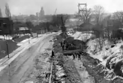 On May 16, 1940, Samuel Johnson, the vice-chair of the NFBC, and McQuesten, who along with his parliamentary role was chair of the commission, ceremonially turned the first sod for the new bridge using a two-handled shovel.[14] Construction had begun two weeks earlier on May 4.[15] The new bridge was assembled over the following 18 months; the design was prepared by New York engineering firm Waddell & Hardesty and supervised by the Edward Lupfer Corporation, the latter the designers of the Peace Bridge.[16] The new structure was located 167 m (548 ft) downstream from the Honeymoon Bridge, as the gorge is slightly wider at that point, resulting in a 288 m (945 ft) span.[17]