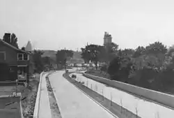 Work continued on the four lane bridge approach throughout 1941, and by mid-1942 it was possible to drive directly from the bridge onto the QEW. The new link featured a traffic circle at Dorchester Road as well as at the QEW.[16] At the time the new link was designated temporarily as part of the QEW[20] (decades before receiving its own unique route number of Highway 420), as a result it was referred to by several names including the Queen Elizabeth Way Extension (and known by locals for decades as the "Queen E Extension")[21] and the Rainbow Bridge Approach.[16]