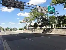 East of the QEW, Highway 420 encounters an interchange with Dorchester Road as both cross the Queenston-Chippawa Power Canal.[7] This interchange was originally a traffic circle that was removed in the early 1970s.[8] The numerous lanes from the QEW interchange to the west begin to converge between residential subdivisions east of Dorchester Road, gradually narrowing to four through lanes at the Drummond Road interchange.[7] After passing beneath Portage Road, the route widens on approach to an at-grade intersection with Stanley Avenue. This intersection is the eastern end of both the freeway segment of the route and the signed King's Highway 420; east of Stanley Avenue the route is signed as Niagara Regional Road 420 and known as Falls Avenue.[9][10]