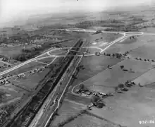 Meanwhile, McQuesten was overseeing construction of the QEW between Toronto and Fort Erie. The new dual highway, inspired by German Autobahns, was the first of its kind in Canada.[lower-alpha 1] The outbreak of World War II in September 1939 temporarily halted McQuesten's ambitions, as funding was quickly shifted to the war effort. As a result, construction on the new superhighway was put on hold south of Niagara Falls. McQuesten officially opened the QEW on August 23, 1940; the pavement ended south of Lundy's Lane.[18] Despite the war, work began on a link between the opened QEW and the Rainbow Bridge through the centre of Niagara Falls. This link would not be completed in time for the opening of the new bridge.[19]