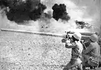 At 15:30, Egyptian forces captured Fort Lahtzanit, the first fortification of the Bar Lev Line to fall,[78] and by then the infantry had been reinforced with 82mm B-10 and 107mm B-11 rifles.[79] At the same time, engineers began operating their water pumps against the sand wall, opening the first passage in less than an hour, and the Egyptians moved up their bridging units to the canal. By 16:30 eight waves had brought across the canal ten infantry brigades in all five bridgeheads, totaling 23,500 men (around 4,700 at each bridgehead). Each bridgehead was on average six kilometers (3¾ mi) wide and around two kilometers deep.[80] The Egyptians had high-velocity 85mm and 100mm rifled anti-tank guns in action on the east bank by that time.[79]