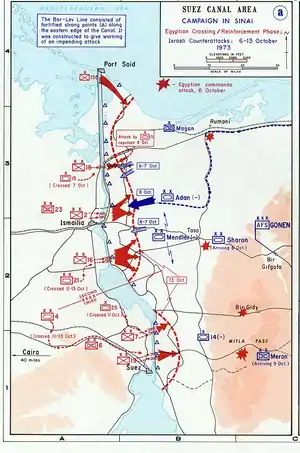 The Israeli command developed a basic defensive plan codenamed Dovecote (Shovach Yonim), the details of which were known to the Egyptians.[45] The plan divided the Bar Lev Line into three sectors: the northern sector defended Arish on the coast to El-Qantarah el-Sharqiyya, the central sector defended Ismailia to Abu-Ageila, and the southern sector defended the area from the Great Bitter Lake to the end of the Suez Canal, and prevented a thrust to the Mitla and Gedy Passes.[5] The 252nd Armored Division, led by Major General Albert Mandler, was charged with the defense of the Bar Lev Line, and incorporated three armored brigades.[5] Positioned 5–9 kilometers (3.1–5.6 mi) behind the series of fortifications was a brigade of 110–120 tanks, led by Colonel Reshef, split into three battalions of 36–40 tanks each, with one battalion to a sector. In case of an Egyptian attack, the brigade was to move forward to occupy tank platforms and firing positions along the Bar Lev Line. A further 20–35 kilometers (12–22 mi) behind the canal were two additional armored brigades led by Colonels Gabi Amir and Dan Shomron, each with around 120 tanks. One brigade was to reinforce the forward armored brigade, while the other brigade counterattacked against the main Egyptian assault.[5]