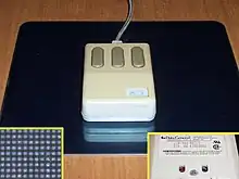 The first two optical mice, first demonstrated by two independent inventors in December 1980, had different basic designs:[1][2][3] One of these, invented by Steve Kirsch of MIT and Mouse Systems Corporation,[4][5] used an infrared LED and a four-quadrant infrared sensor to detect grid lines printed with infrared absorbing ink on a special metallic surface. Predictive algorithms in the CPU of the mouse calculated the speed and direction over the grid. The other type, invented by Richard F. Lyon of Xerox, used a 16-pixel visible-light image sensor with integrated motion detection on the same n‑type (5 µm) MOS integrated circuit chip,[6][7] and tracked the motion of light dots in a dark field of a printed paper or similar mouse pad.[8] The Kirsch and Lyon mouse types had very different behaviors, as the Kirsch mouse used an x-y coordinate system embedded in the pad, and would not work correctly when the pad was rotated, while the Lyon mouse used the x-y coordinate system of the mouse body, as mechanical mice do.