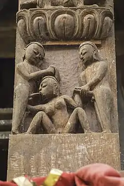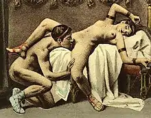 In Ancient Rome, fellatio was considered profoundly taboo.[37] Sexual acts were generally seen through the prism of submission and control. This is apparent in the two Latin words for the act: irrumare (to penetrate orally), and fellare (to be penetrated orally). Under this system, it was considered to be abhorrent for a male to perform fellatio, since that would mean that he was penetrated (controlled), whereas receiving fellatio from a woman or another man of lower social status (such as a slave or debtor) was not humiliating. The Romans thought of oral sex as being far more shameful than, for example, anal sex – known practitioners were supposed to have foul breath and were often unwelcome as guests at a dinner table.[37] This was highlighted in Roman attitudes towards irrumatio, in which it was strictly considered a form of oral rape, and any man who irrumated another person was considered to be extremely virile.[38] Irrumatio was so degrading in Roman society in fact that it was often used as a method of punishment.[38]