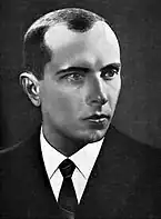The OUN was led by a Vozhd or Supreme Leader. Originally the Vozhd was Yevhen Konovalets ; after his assassination he was succeeded by Andriy Melnyk resulting in a split where the Galician youths followed their own Vozhd, Stepan Bandera. Underneath the Vozhd were the Provid, or directorate. At the start of the second world war the OUN's leadership consisted of the Vozhd, Andrii Melnyk, and eight members of the Provid.[98] The Provid members were: Generals Kurmanovych and Kapustiansky (both generals from the times of Ukraine's revolution in 1918–1920); Yaroslav Baranovsky, a law student; Dmytro Andriievsky, a politically moderate former diplomat of the revolutionary government from eastern Ukraine; Richard Yary, a former officer of the Austrian and Galician militaries who served as a liaison with the German intelligence services, the Abwehr; colonel Roman Sushko, another former Austrian and Galician officer; Mykola Stsyborsky, the son of a tsarist military officer from Zhytomir, who served as the OUN's official theorist; and Omelian Senyk, a party organizer and veteran of the Austrian and Galician armies who by the 1940s was considered too moderate and too conservative by the youngest generation of Galician youths.[98] Yary would be the only member of the original Provid to join Bandera after the OUN split.[99]