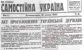 Eight days after Germany's invasion of the USSR, on 30 June 1941, the OUN-B proclaimed the establishment of Ukrainian State in Lviv, with Yaroslav Stetsko as premier.