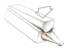 | A large flap lesion in the femur head typical of late stage Osteochondritis dissecans. In this case, the lesion was caused by avascular necrosis of the bone just under the cartilage. | |