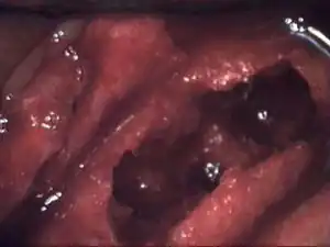 The definitive symptom of ONJ is the exposure of mandibular or maxillary bone through lesions in the gingiva that do not heal.[4] Pain, inflammation of the surrounding soft tissue, secondary infection or drainage may or may not be present. The development of lesions is most frequent after invasive dental procedures, such as extractions, and is also known to occur spontaneously. There may be no symptoms for weeks or months, until lesions with exposed bone appear.[5] Lesions are more common on the mandible than the maxilla.