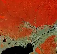 The Ottawa River has large areas of wetlands. Some of the more biologically important wetland areas include (going downstream from Pembroke), the Westmeath sand dune/wetland complex, Mississippi Snye, Breckenridge Nature Reserve, Shirleys Bay, Ottawa Beach/Andrew Haydon Park, Petrie Island, the Duck Islands[12] and Greens Creek.[13][14] The Westmeath sand dune/wetland complex is significant for its relatively pristine sand dunes, few of which remain along the Ottawa River, and the many associated rare plants. Shirleys Bay has a biologically diverse shoreline alvar, as well as one of the largest silver maple swamps along the river. Like all wetlands, these depend upon the seasonal fluctuations in the water level.[15] High water levels help create and maintain silver maple swamps,[16] while low water periods allow many rare wetland plants to grow on the emerged sand and clay flats.[17] There are five principal wetland vegetation types. One is swamp, mostly silver maple. There are four herbaceous vegetation types, named for the dominant plant species in them: Scirpus, Eleocharis, Sparganium and Typha.[18] Which type occurs in a particular location depends upon factors such as substrate type, water depth, ice-scour and fertility. Inland, and mostly south of the river, older river channels, which date back to the end of the ice age, and no longer have flowing water, have sometimes filled with a different wetland type, peat bog. Examples include Mer Bleue and Alfred Bog.[13]