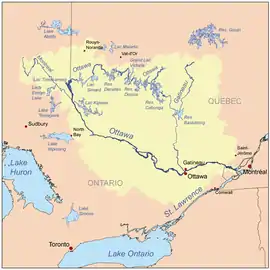 The river rises at Lac des Outaouais, north of the Laurentian Mountains of central Quebec, and flows west to Lake Timiskaming. From there its route has been used to define the interprovincial border with Ontario.