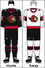 In 2020, the Senators reintroduced its 1997–2007 logo with the jersey set used from 1992 to 1995.[175] The updated logo uses a gold outline as opposed to red. The new uniforms, while largely resembling the originals from the 1990s, retained the lettering font used since the Adidas takeover, while the white uniforms retained only the black and red stripes along the upper arm sleeves. Both the home and away uniforms include a red band across the very bottom of the jerseys.[176][177] In addition, the Senators unveiled a "Reverse Retro" alternate uniform; the design was of the original 1992–93 uniform but with red as the base colour.[178] In the 2022–23 season, the Senators wore "Reverse Retro" uniforms based on the alternates they wore from 1997 to 2007, but with the current 2-D logo in front, black as the base colour and less white elements.[179]