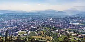 Oviedo (Spanish: [oˈβjeðo]) or Uviéu (Asturian: [uˈβjeʊ̯]) (official name: Oviedo/Uviéu) is the capital city of the Principality of Asturias in northern Spain and the administrative and commercial centre of the region. It is also the name of the municipality that contains the city. Oviedo is located approximately 24 km (15 mi) southwest of Gijón[2] and 23 km (14 mi) southeast of Avilés,[3] both of which lie on the shoreline of the Bay of Biscay. Oviedo's proximity to the ocean of less than 30 kilometres (19 mi) in combination with its elevated position with areas of the city more than 300 metres above sea level causes the city to have a maritime climate, in spite of its not being located on the shoreline itself.