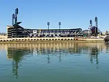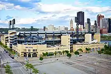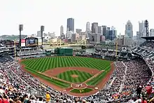 PNC Park is a baseball stadium on the North Shore of Pittsburgh, Pennsylvania. It is the fifth home ballpark of Major League Baseball's Pittsburgh Pirates.[8][9] Opened during the 2001 MLB season, PNC Park sits along the Allegheny River with a view of the Downtown Pittsburgh skyline. Constructed of steel and limestone, it has a natural grass playing surface and can seat 38,747 people for baseball. It was built just to the east of its predecessor, Three Rivers Stadium, which was demolished in 2001.