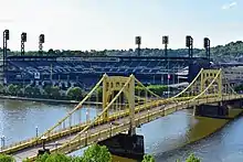 There was popular sentiment by fans for the Pirates to name the stadium after former outfielder Roberto Clemente. However, locally based PNC Financial Services purchased the stadium's naming rights in August 1998.[10][26] Under the agreement, PNC Bank paid the Pirates about $2 million each year through 2020; it also maintains a full-service PNC branch at the stadium.[27][28] The total cost of PNC Park was $216 million.[8][9] Shortly after the naming rights deal was announced, the city of Pittsburgh renamed the 6th Street Bridge near the southeast corner of the site of the park the Roberto Clemente Bridge as a compromise to fans who had wanted the park named after Clemente.[29]