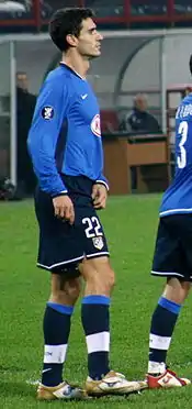His first call-up to the senior national squad came in October 2004, for World Cup qualifiers against Belgium and Lithuania, as a replacement for Juanito who dropped out of the original selection because of injury.[53] Carlos Marchena and Carles Puyol were the centre-back pairing in possession, and Pablo remained on the bench for both games.[54] He made his international debut on 17 November 2004 in a friendly against England in Madrid.[55] He entered the game as a half-time substitute for Marchena, with Spain leading 1–0; with 20 minutes left, he appeared to foul Alan Smith in the act of shooting, but no penalty was awarded – he told Mundo Atleti that Smith had thrown himself to the floor once he realised he could not reach the ball – and Spain had no difficulty retaining their lead.[56] Pablo replaced Iván Helguera, who had previously been a regular selection, in the squad for Spain's next match, a World Cup qualifier at home to San Marino in February 2005,[57] but did not play.