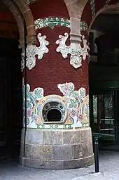 Originally, guests entered the palace from the street through two arches supported by thick pillars that opened into the vestibule. The former ticket windows, which are located in the center pillar, are beautiful concentric arches adorned with floral mosaics of various materials created by Lluís Bru.