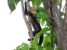 The Panamanian white-faced capuchin sometimes interacts with other sympatric monkey species. Panamanian white-faced capuchins sometimes travel with and even groom Geoffroy's spider monkeys.[12][41] However, aggressive interactions between the capuchins and spider monkeys also occur.[44] Interactions between the Panamanian white-faced capuchin and mantled howler are infrequent, and sometimes result in the capuchins threatening the larger howlers.[41] However, affiliative associations between the capuchins and howlers do sometimes occur, mostly involving juveniles playing together.[44]