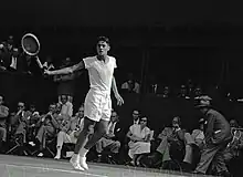 Gonzales was a prominent professional champion in the 1950s and 1960s, winning world professional championship tours between 1954 and 1961; he was the world number one ranked male tennis player professional between 1952 and 1961.[5] Gonzales was a determined competitor with a fierce temper. He was often at odds with officials and promoters. However, he was a fan favorite who drew many spectators.[6]