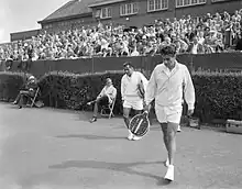 Gonzales didn't play on the pro circuit at all in 1962. His only appearance in 1963 was at the United States Professional Championship, which were held that year at the hallowed Forest Hills courts. Gonzales both dismayed and infuriated his colleagues by being the only player who was paid for his participation. Having learned by bitter experience about the exigencies of the pro tour, Gonzales had demanded, and received, US$5,000 in advance for his appearance in the tournament.[108] An out-of-shape, semi-retired Gonzales was beaten in the first round by Alex Olmedo.[109] Ken Rosewall eventually beat Rod Laver in the finals but neither of them collected a penny: the promoter had failed to obtain a television contract, could not meet his costs and couldn't pay any prize money to any of the players.[110]