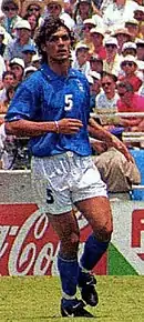 Maldini participated in his first World Cup in 1990 on home soil, appearing in all seven Italy matches. He helped Italy to win five consecutive games and was a starting member of the defence that kept a FIFA World Cup record of five consecutive clean sheets. The Italian defence eventually conceded an equalising goal in the semi-final match against Carlos Bilardo's Argentina, after going a World Cup record total of 518 minutes without conceding.[68] Following two periods of extra time, in which neither team was able to score, Italy lost out to Argentina on penalties. Italy eventually placed third after defeating England 2–1 in the third-place final match, and finishing the tournament with the best defence having conceded two goals throughout the entire World Cup. Maldini was elected to be part of the Team of the Tournament.[28][62]