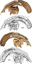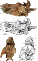 In 1961, the third species, P. cyrtocristatus was named by John Ostrom.[12] Its three known specimens have been found in the Fruitland and Kaiparowits formations of Utah and New Mexico.[2] The second specimen, the first known from the Kaiparowits Formation, was originally unassigned to a specific taxon.[13] Of the Parasaurolophus species, P. cyrtocristatus is the smallest and has the most curved crest.[8] Because of its possession of the two above features, it has often been speculated that it was a female of P. walkeri or P. tubicen, which were all thought to be males,[14][18] although P. tubicen lived approximately a million years later.[2] As noted by Thomas Williamson, the type material of P. cyrtocristatus is about 72% the size of P. tubicen, close to the size at which other lambeosaurines are interpreted to begin showing definitive sexual dimorphism in their crests (~70% of adult size).[11] Even though many scientists have supported the possible fact of P. cyrtocristatus being a female,[18][19] many other studies have found that it is not[16][6] because of the differences in age, distribution, and the large differences in the crest and its internal structure.[14]