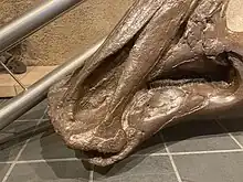 Most of these hypotheses have been discredited or rejected.[30] For example, there is no hole at the end of the crest for a snorkeling function. There are no muscle scars for a proboscis and it is dubious that an animal with a beak would need one. As a proposed airlock, it would not have kept out water. The proposed air reservoir would have been insufficient for an animal the size of Parasaurolophus. Other hadrosaurids had large heads without needing large hollow crests to serve as attachment points for supporting ligaments.[40] Also, none of the proposals explain why the crest has such a shape, why other lambeosaurines should have crests that look much different but perform a similar function, how crestless or solid-crested hadrosaurids got along without such capabilities, or why some hadrosaurids had solid crests. These considerations particularly impact hypotheses based on increasing the capabilities of systems already present in the animal, such as the salt gland and olfaction hypotheses,[31] and indicate that these were not primary functions of the crest. Additionally, work on the nasal cavity of lambeosaurines shows that olfactory nerves and corresponding sensory tissue were largely outside the portion of the nasal passages in the crest, so the expansion of the crest had little to do with the sense of smell.[32]