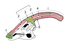 Parasaurolophus is often hypothesized to have used its crest as a resonating chamber to produce low frequency sounds to alert other members of a group or its species.[18] This function was originally suggested by Wiman in 1931 when he described P. tubicen. He noted that the crest's internal structures are similar to those of a swan and theorized that an animal could use its elongated nasal passages to create noise.[18][9] However, the nasal tubes of Hypacrosaurus, Corythosaurus, and Lambeosaurus are much more variable and complicated than the airway of Parasaurolophus. A large amount of material and data supports the hypothesis that the large, tubular crest of Parasaurolophus was a resonating chamber. Weishampel in 1981 suggested that Parasaurolophus made noises ranging between the frequencies 55 and 720 Hz, although there was some difference in the range of individual species because of the crest size, shape, and nasal passage length, most obvious in P. cyrtocristatus (interpreted as a possible female).[18] Hopson found that there is anatomical evidence that hadrosaurids had a strong hearing. There is at least one example, in the related Corythosaurus, of a slender stapes (reptilian ear bone) in place, which combined with a large space for an eardrum implies a sensitive middle ear. Furthermore, the hadrosaurid lagena is elongate like a crocodilian's, indicating that the auditory portion of the inner ear was well-developed.[19] Based on the similarity of hadrosaurid inner ears to those of crocodiles, he also proposed that adult hadrosaurids were sensitive to high frequencies, such as their offspring might produce. According to Weishampel, this is consistent with parents and offspring communicating.[18]