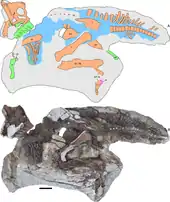 John Ostrom described another good specimen (FMNH P27393) from New Mexico as P. cyrtocristatus in 1961. It includes a partial skull with a short, rounded crest and much of the postcranial skeleton except for the feet, neck, and parts of the tail.[12] Its specific name is derived from the Latin words curtus, meaning "shortened" and cristatus, meaning "crested".[10] The specimen was found in either the top of the Fruitland Formation or, more likely, the base of the overlying Kirtland Formation.[8] The range of this species was described in 1979, when David B. Weishampel and James A. Jensen described a partial skull with a similar crest (BYU 2467) from the Campanian age Kaiparowits Formation of Garfield County, Utah.[13] Since then, another skull has been found in Utah with the short, rounded P. cyrtocristatus crest morphology.[8]