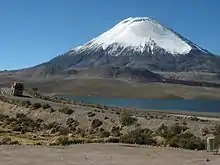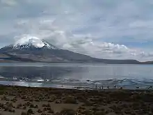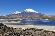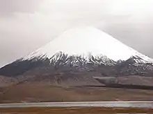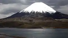 Parinacota (in Hispanicized spelling), Parina Quta or Parinaquta is a dormant stratovolcano on the border of Bolivia and Chile. Together with Pomerape it forms the Nevados de Payachata volcanic chain. Part of the Central Volcanic Zone of the Andes, its summit reaches an elevation of 6,380 metres (20,930 ft) above sea level. The symmetrical cone is capped by a summit crater with widths of 1 kilometre (0.62 mi) or 1,000 metres (3,300 ft). Farther down on the southern slopes lie three parasitic centres known as the Ajata cones. These cones have generated lava flows. The volcano overlies a platform formed by lava domes and andesitic lava flows.