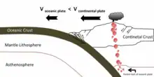 The Nazca Plate and Antarctic Plate subduct beneath the South America Plate in the Peru-Chile Trench at a pace of 7–9 centimetres per year (2.8–3.5 in/year) and 2 centimetres per year (0.79 in/year), respectively, resulting in volcanic activity in the Andes.[11] Present-day volcanism occurs within four discrete belts: The Northern Volcanic Zone (NVZ), the Central Volcanic Zone (CVZ), the Southern Volcanic Zone (SVZ) and the Austral Volcanic Zone (AVZ).[12] These extend between 2°N-5°S, 16°S-28°S, 33°S-46°S[13] and 49°S-55°S, respectively.[11] Between them they contain about 60 active volcanoes and 118 volcanoes which appear to have been active during the Holocene, not including potentially active very large silicic volcanic systems or very small monogenetic ones.[11] These belts of active volcanism occur where the Nazca Plate subducts beneath the South America Plate at a steep angle, while in the volcanically inactive gaps between them the subduction is much shallower;[14] thus there is no asthenosphere between the slab of the subducting plate and the overriding plate in the gaps.[11]