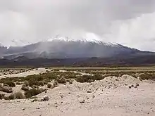Parinacota shows evidence of a major sector collapse (a giant landslide),[1] whose deposit was originally interpreted to be a lava flow.[41][42] The collapse removed a volume of about 5–6 cubic kilometres (1.2–1.4 cu mi) from the cone, plunged over 1,900 metres (6,200 ft) vertical distance[43] and flowed 23 kilometres (14 mi) west, covering a surface area of 110 square kilometres (42 sq mi)[44] or 253 square kilometres (98 sq mi) with debris; the volume is not very well established.[43] [45]