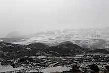 Periglacial landscapes are frequent in the area; they include rounded landforms, smooth surfaces, solifluction terrain and striated terrain.[78] This extensiveness is the result of the relatively dry climate in the region, which limits the development of glaciers.[79] On Parinacota, landforms of this type are found starting from 4,450 metres (14,600 ft) elevation and become dominant above 5,300 metres (17,400 ft) until the glacier line.[37] The extent of their development is a function of the age of the underlying rocks as well; Holocene volcanic rocks have little periglacial alteration while older rock formations at times are heavily altered.[36] Lahars also occurred during the history of Parinacota; 0.2–2 metres (7.9 in – 6 ft 6.7 in) thick layers of lahar deposits are found on the southern and eastern slopes[23] and form a fan on the northwestern slope of Parinacota. At this fan, lahar deposits reach distances of 15 kilometres (9.3 mi) away from the volcano.[22]