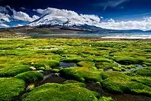 Vegetation at Lake Chungará; the summit of Parinacota is enveloped in a cloud