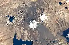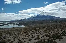 Parinacota lies on the western margin of the Altiplano in the Central Andes. The border between Bolivia and Chile bisects the volcano and runs along the rim of the crater, which lies in Bolivia.[6] In Chile, where most of the edifice is located,[7] Parinacota lies in the commune of Putre, Arica y Parinacota Region, and in Bolivia in the Oruro Department of the Sajama Province.[8] The towns of Ajata and Parinacota lie southwest and west of the volcano, respectively.[9] The region lies at high altitude and access is difficult, hampering research on the volcanoes of the Central Andes.[10]