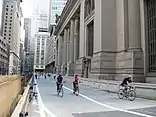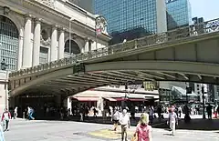 The western leg is 35 feet (11 m) wide; the eastern leg is 33 feet (10 m) wide between 42nd and 44th Streets, widening to 53 feet (16 m) north of 44th Street. The roadway above 42nd Street, which connects the two legs, is 40 feet (12 m) wide.[19] The portion of the viaduct immediately surrounding the terminal's building has a masonry balustrade with an additional metal guardrail.[3] There is a cast-iron eagle atop the balustrade where the western leg curves onto the connecting roadway above 42nd Street.[20][21] A sidewalk, accessible from the Grand Hyatt hotel, runs along the section of the viaduct that is parallel to 42nd Street.[16]