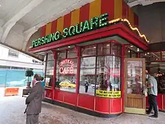 In 1995, the city and the Grand Central Partnership unveiled plans to restore the space under the viaduct at a cost of $2 million, then lease it as a restaurant.[83] The restaurant space would be located in the former site of the World's Fair information center.[72][83] The Pershing Square Cafe signed a lease at the space in 1997.[84] The owner of the renovated space, Michael O'Keeffe, placed so much attention to the renovation of the space that the project's costs increased to $5 million, and the cafe's opening date was pushed back by several months.[85]