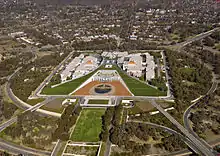 The site covers 80 acres (32 hectares).[6] The building was designed to sit above Old Parliament House when seen from a distance. The building is four metres (13 feet) higher than the original height of the hill.[6] About one million cubic metres (35,000,000 cubic feet) of rock had to be excavated from the site. It was used to fill low-lying areas in the city.[6] Most of the granite used was sourced from Australia. Twice the amount needed was quarried as a very high standard of granite was required particularly for the curved walls.[6]
