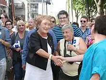 Based on the charter's growing popularity among francophones, Marois called an early election for 7 April 2014 in an attempt to win a majority government. Despite leading in the polls when the writ was dropped, the campaign went badly due to several mishaps. The recruitment of star candidate Pierre Karl Péladeau, whose comments made sovereignty and the prospect of another referendum a focus of the campaign, as well as feminist Janette Bertrand suggesting that wealthy Muslim men were taking over swimming pools, among other incidents badly hurt the PQ.[27] Marois' government was defeated by the Liberals, led by Philippe Couillard, in the 2014 provincial election which resulted in a Liberal majority government. The PQ won 25% of the vote and 30 seats, its worst result in terms of popular vote since 1970. Marois lost her own seat, and announced her intention to resign as PQ leader that night.[28]