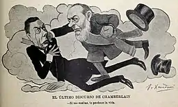 The impression of Kruger garnered by the British envoys in Pretoria during early 1877 was one of an unspeakably vulgar, bigoted backveld peasant.[81] Regarding his austere, weather-beaten face, greying hair and simple Dopper dress of a short-cut black jacket, baggy trousers and a black top hat, they considered him extremely ugly. Furthermore, they found his personal habits, such as copious spitting, revolting. Shepstone's legal adviser William Morcom was one of the first British officials to write about Kruger: calling him "gigantically horrible", he recounted a public luncheon at which Kruger dined with a dirty pipe protruding from his pocket and such greasy hair that he spent part of the meal combing it.[82] According to Martin Meredith, Kruger's unsightliness was mentioned in British reports "so often that it became shorthand for his whole personality, and indeed, his objectives".[82] They did not consider him a major threat to British ambitions.[82]