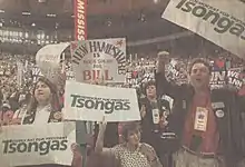 Tsongas pulled out of the race on 19 March 1992, and endorsed Clinton.[19][20] However, a number of the Tsongas delegates continued to support the former Senator, and voted for Tsongas on the first ballot at the Convention. The roll call yielded 289 votes for Tsongas, placing him in 3rd place behind Clinton and then-former California Governor, Jerry Brown. During the convention Tsongas tried to include a platform plank calling for a delay in tax cuts or tax credits until the budget could be balanced, which was overwhelmingly defeated.[21]