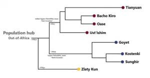- Research by Poznik et al. (2016) suggests that Oase 1 Y-DNA belongs to haplogroup K2a*. That is, Oase 1 possesses SNPS similar to Ust'-Ishim man (also K2a*), 45,000-year-old remains from Siberia, and upstream from Haplogroup NO and a rare lineage found in two living males (from ethnic Telugu and Malay backgrounds, respectively, for whom Poznik et al. proposed the creation of a new subclade, named "K2a1").[10] (Earlier research by Fu et al. reported that Oase 1 belonged to a subclade of Y-DNA haplogroup F, other than haplogroups G, H, I and J – leaving open the possibility that Oase 1 belonged to macrohaplogroup K.)