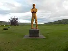 A 12-foot-tall (3.7 m) wooden statue stands at the Riverfront Park in Peace River to commemorate Henry Fuller Davis, one of the most famous figures in the Town of Peace River's history. His “Twelve-Foot Davis” nickname stems from the 12-foot land claim during the Cariboo Country gold rush in British Columbia which netted him almost $30,000 worth of gold. He took these profits and staked it all on a trading post close to where the Town of Peace River stands today. It is for this reason that the Town of Peace River is sometimes referred to as the Land of Twelve-Foot Davis. Twelve-Foot Davis' gravesite is designated a park and is located on the top of Grouard Hill just east of the town.