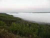 Moisture coming with Pacific Ocean air is lost over the mountain ranges as precipitation before moving into the area, while air from the Arctic flows uninterrupted into the region. Due to cold air drainage, the river valley is often completely filled with stratus and fog while outside the valley is clear. The fog usually clears in a few hours. Winds in town are channeled along the Peace River valley (towards the northeast or southwest) while winds outside the valley are quite variable. During both summer and winter, the wind patterns outside the valley are mostly from the southwest or north. The passage of a migratory low to the north of Peace River will cause southwest winds to shift around to the north.[27]