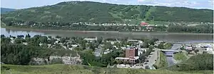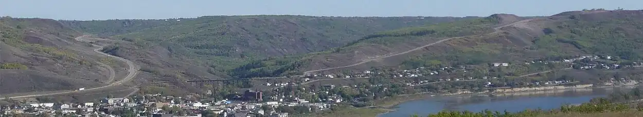 The specific landform in which the town is situated is the Peace River Lowland which was incised by the Peace River and its tributaries right through the area's former glacial lake sediments and into the Cretaceous bedrock.[24] The Peace River Lowlands is flanked by the Buffalo Head Hills to the east and the Whitemud and Clear Hills to the west.