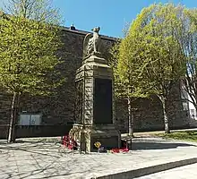 Throughout much of the 20th century (1911 to 1961) the population density in the county remained stable while it rose in England and Wales as a whole.[64] There was considerable military activity in Pembrokeshire and offshore in the 20th century: a naval base at Milford Haven because German U-boats were active off the coast in World War I[65] and, in World War II, military exercises in the Preseli Mountains and a number of military airfields.[66] The wartime increase in air activity saw a number of aircraft accidents and fatalities, often due to unfamiliarity with the terrain.[67] From 1943 to 1944, 5,000 soldiers from the United States Army's 110th Infantry Regiment were based in the county, preparing for D-Day.[68][69] Military and industrial targets in the county were subjected to bombing during World War II.[70] After the end of the war, German prisoners of war were accommodated in Pembrokeshire, the largest prison being at Haverfordwest, housing 600.[71] The County of Pembroke War Memorial in Haverfordwest carries the names of 1,200 of those that perished in World War I.[72]