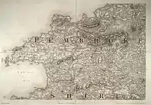 In 1720, Emmanuel Bowen[58] described Pembrokeshire as having five market towns, 45 parishes and about 4,329 houses, with an area of 420,000 acres (1,700 km2). In 1791 a petition was presented to the House of Commons concerning the poor state of many of the county's roads, pointing out that repairs could not be made compulsory by the law as it stood. The petition was referred to committee.[59]: 178 People applying for poor relief were often put to work mending roads. Workhouses were poorly documented. Under the Poor Laws, costs and provisions were kept to a minimum, but the emphasis was often on helping people to be self-employed. While the Poor Laws provided a significant means of support, there were many charitable and benefit societies.[60] After the Battle of Fishguard, the failed French invasion of 1797, 500 French prisoners were held at Golden Hill Farm, Pembroke.[61] From 1820 to 1878 one of the county's prisons, with a capacity of 86, was in the grounds of Haverfordwest Castle.[62] In 1831, the area of the county was calculated to be 345,600 acres (1,399 km2) with a population of 81,424.[58]