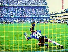 - A kick results in a goal scored for the kicking team if, having been touched once by the kicker, the ball crosses the goal line between the goal posts and under the crossbar, without touching any player, official, or outside agent other than the defending goalkeeper. The ball may touch the goalkeeper, goal posts, or crossbar any number of times before going into the goal as long as the referee believes the ball's motion is the result of the initial kick. This was clarified after an incident in the 1986 World Cup shoot-out between Brazil and France. Bruno Bellone's kick rebounded out off the post, hit goalkeeper Carlos's back, and subsequently bounced into the goal. Referee Ioan Igna gave the goal to France, and Brazil captain Edinho was booked for protesting that the kick should have been considered a miss as soon as it rebounded off the post. In 1987, the International Football Association Board clarified Law 14, covering penalty kicks, to support Igna's decision.[11]