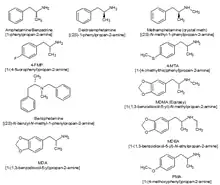 Substituted amphetamines are a class of compounds based upon the amphetamine structure;[56] it includes all derivative compounds which are formed by replacing, or substituting, one or more hydrogen atoms in the amphetamine core structure with substituents.[56][57][58] Examples of substituted amphetamines are amphetamine (itself),[56][57] methamphetamine,[56] ephedrine,[56] cathinone,[56] phentermine,[56] mephentermine,[56] bupropion,[56] methoxyphenamine,[56] selegiline,[56] amfepramone,[56] pyrovalerone,[56] MDMA (ecstasy), and DOM (STP). Many drugs in this class work primarily by activating trace amine-associated receptor 1 (TAAR1);[59] in turn, this causes reuptake inhibition and effluxion, or release, of dopamine, norepinephrine, and serotonin.[59] An additional mechanism of some substituted amphetamines is the release of vesicular stores of monoamine neurotransmitters through VMAT2, thereby increasing the concentration of these neurotransmitters in the cytosol, or intracellular fluid, of the presynaptic neuron.[60]