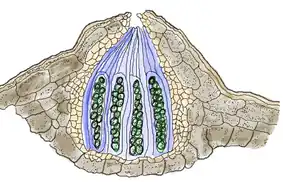 An ascocarp, or ascoma (PL: ascomata), is the fruiting body (sporocarp) of an ascomycete phylum fungus. It consists of very tightly interwoven hyphae and millions of embedded asci, each of which typically contains four to eight ascospores. Ascocarps are most commonly bowl-shaped (apothecia) but may take on a spherical or flask-like form that has a pore opening to release spores (perithecia) or no opening (cleistothecia).[1][2]
